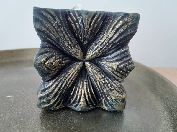 Prachitge kubus kaars met goud accenten. De kaars is gemaakt van sojawas