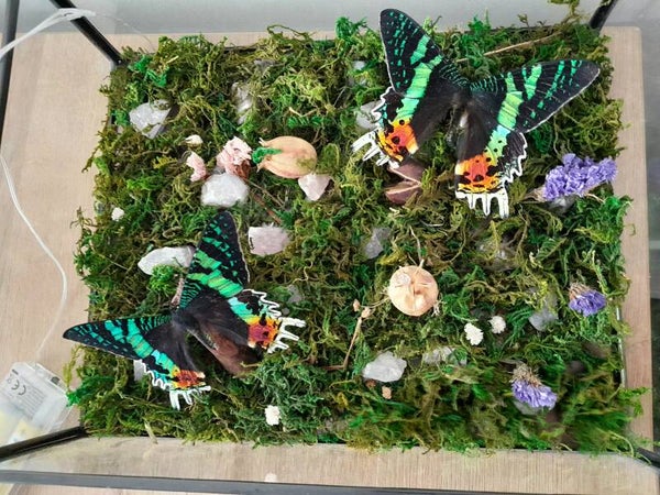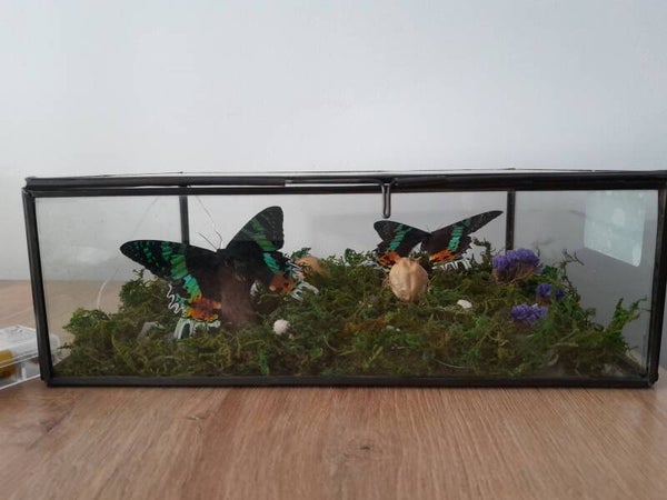 Gave kistje van koperkleur met twee Urania Ripheus op droogbloemen en rozenkwarts. Zoals op de foto te zien geeft de rozenkwarts LED licht. Echt een uniek stuk waar geen tweede van is.
