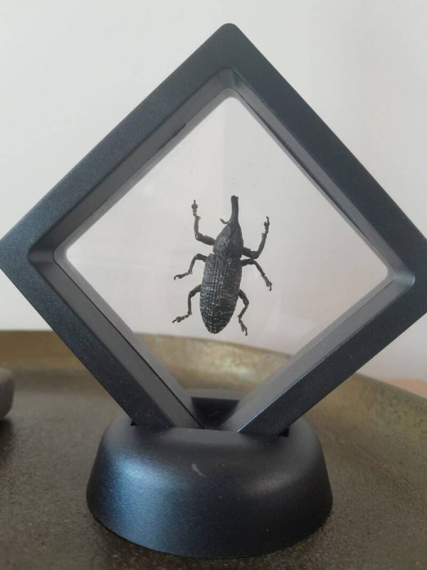 Deze kever ziet u niet vaak. Echt een leuke soort om van dichtbij te kunnen bekijken. De kever zit tussen twee lagen plastic maar het geheel geeft een leuk effect. Voordeel van deze lijst is dat u de kever van beide kanten kunt bekijken.